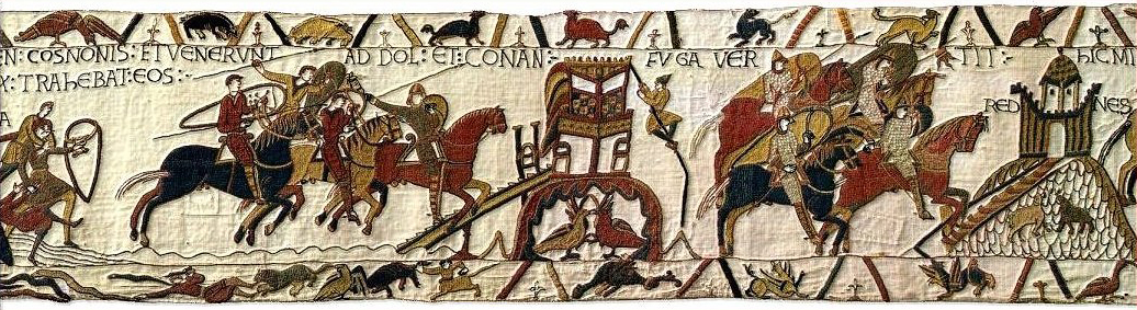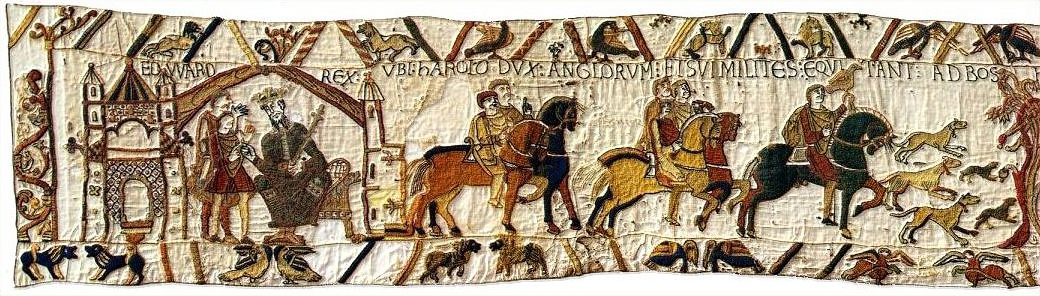 The tapestry is a band of linen 231 feet (70 metres) long and 19.5 inches (49.5 cm) wide, now light brown with age, on which are embroidered, in worsteds of eight colours, more than 70 scenes representing the Norman Conquest. The story begins with a prelude to Harold's visit to Bosham on his way to Normandy (1064?) and ends with the flight of Harold's English forces from Hastings (October 1066); originally, the story may have been taken further, but the end of the strip has perished. Along the top and the bottom run decorative borders with figures of animals, scenes from the fables of Aesop and Phaedrus, scenes from husbandry and the chase, and occasionally scenes related to the main pictorial narrative. It has been restored more than once, and in some details the restorations are of doubtful authority.