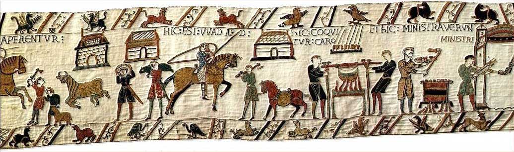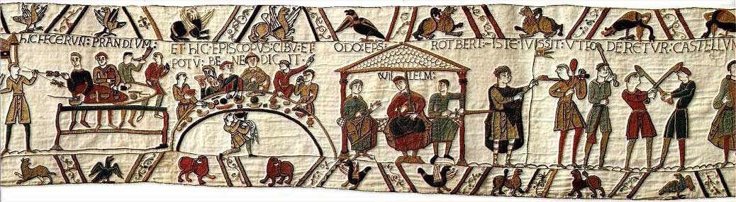 HIC FECERUNT PRANDIUM. HIC EPISCOPUS CIBUM ET POTUM BENEDICIT. ODO EPISCOPUS. WILLELM. ROTBERT. ISTE IUSSIT UT FODERETUR CASTELLUM. AT HESTENGAMCEASTRA. |